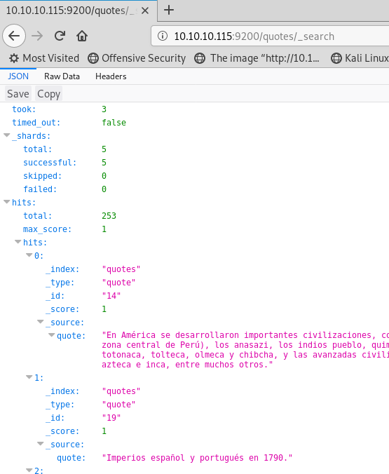 Elasticsearch eh? Even have the version that is running. I'll table that for later if needed. I'll fully admit that while I knew what elasticsearch was I had absolutely no idea how to work with it prior to this engagement. After doing a bit searching around and getting the hang of some basics I was able to take get search and queries working. Discovered the quotes index and found some interesting information.