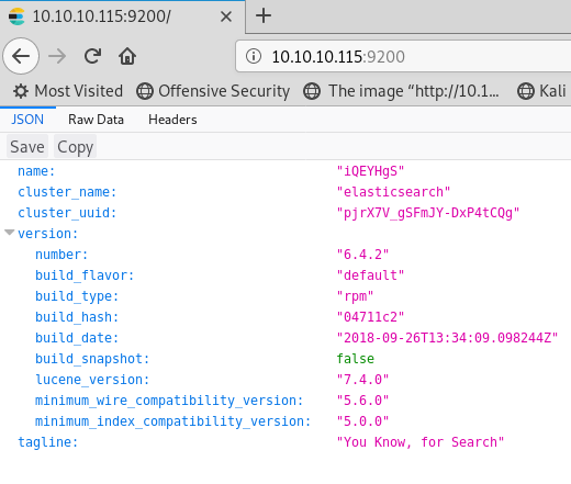 |_http-title: Site doesn't have a title (application/json; charset=UTF-8).Port 9200 seems interesting. It looks like it's a web-service of some kind so let's open it up and take a look.