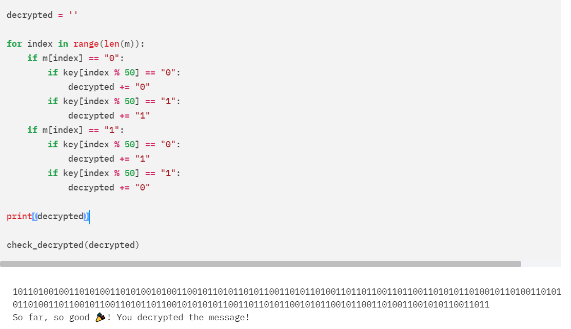 With our key established we are provided Alice's encrypted message. While iterating through the message and our key I decided to take an "easier" approach and keep the logic using strings rather than covert them to digits. I wrote my own simple variant of XOR while iterating through our strings.